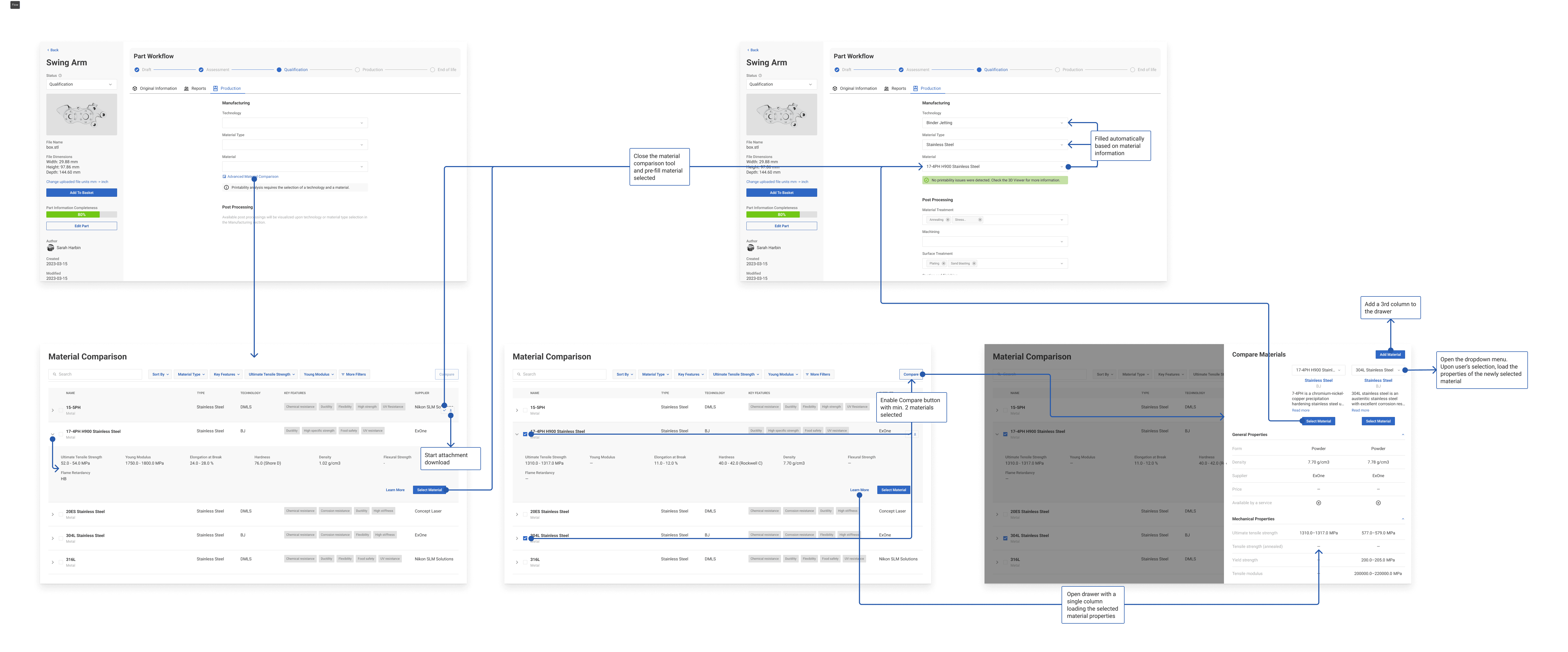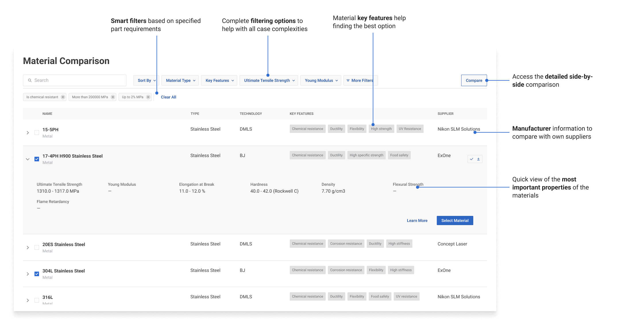 User chooses from an automatically and smartly filtered list of materials based on their specified part requirements.